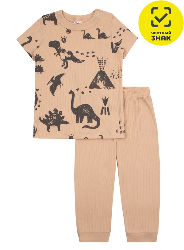 Пижамный комплект из нежного полотна «лапша». Футболка из набивного полотна с короткими втачными рукавами, округлой горловиной, застежкой на кнопки по плечу. Брюки полуоблегающего силуэта, по тали на резинке, зауженные к низу на манжет, выполнены из гладкокрашеного полотна.