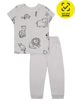 Пижамный комплект из нежного полотна «лапша». Футболка из набивного полотна с короткими втачными рукавами, округлой горловиной, застежкой на кнопки по плечу. Брюки полуоблегающего силуэта, по тали на резинке, зауженные к низу на манжет, выполнены из гладкокрашеного полотна.