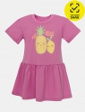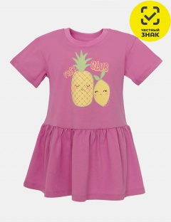 Платье для девочки из мягкого трикотажа. Силуэт расклешенный, подрез в виде юбочки со сборкой, спущенное плечо. Горловина круглая, оформлена кашкорсе. На плече застежка на кнопки. На полочке выполнена шелкография в виде фруктов и надписи - фруктовый клуб.