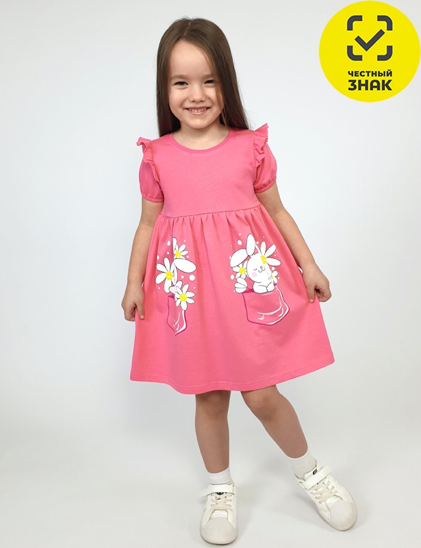 Платье для девочки, перед и спинка с кокеткой, сборка по верху юбки. Рукав короткий, внизу собран на резинку, в пройме рюша. Горловина обработана ластиком. Печать на переднем полотнище юбки.