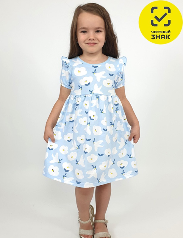 Платье для девочки - перед и спинка с кокеткой, сборка по верху юбки. Рукав короткий, внизу собран на резинку, в пройме рюша. Горловина обработана ластиком.