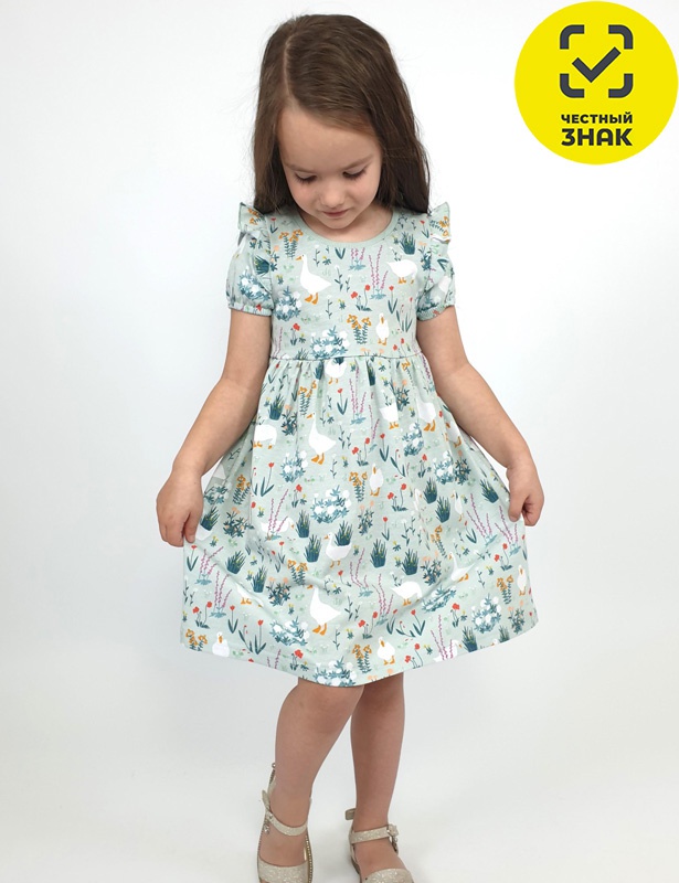 Платье для девочки - перед и спинка с кокеткой, сборка по верху юбки. Рукав короткий, внизу собран на резинку, в пройме рюша. Горловина обработана ластиком.