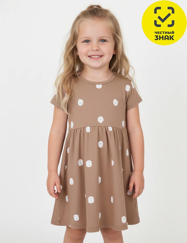 Платье для девочки из набивного полотна, короткие втачные рукава, округлый вырез горловины, окантованный бейкой из основного полотна, отрезное по линии талии, юбка со сборкой.