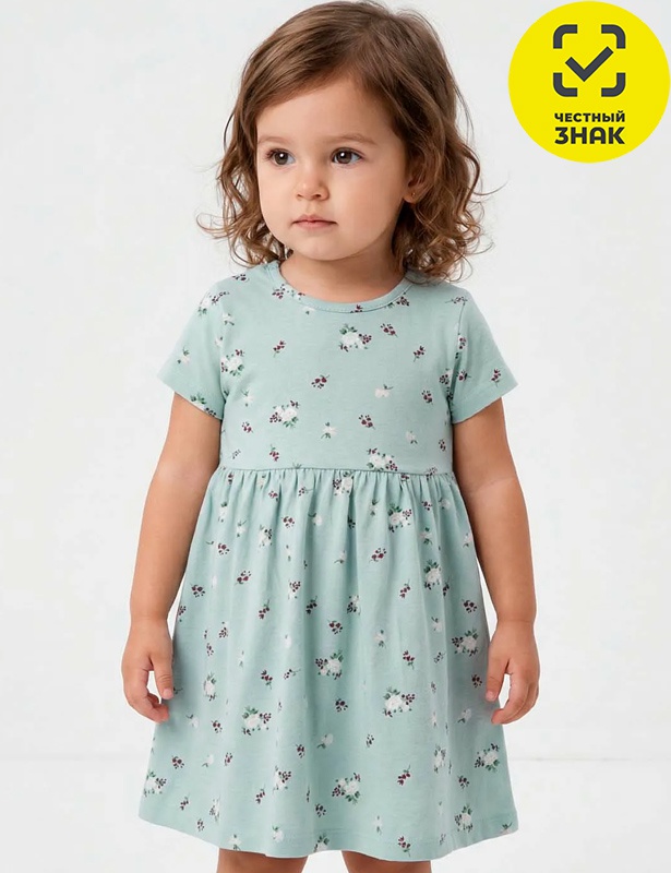 Платье для девочки из набивного полотна, короткие втачные рукава, округлый вырез горловины, окантованный бейкой из основного полотна, отрезное по линии талии, юбка со сборкой.