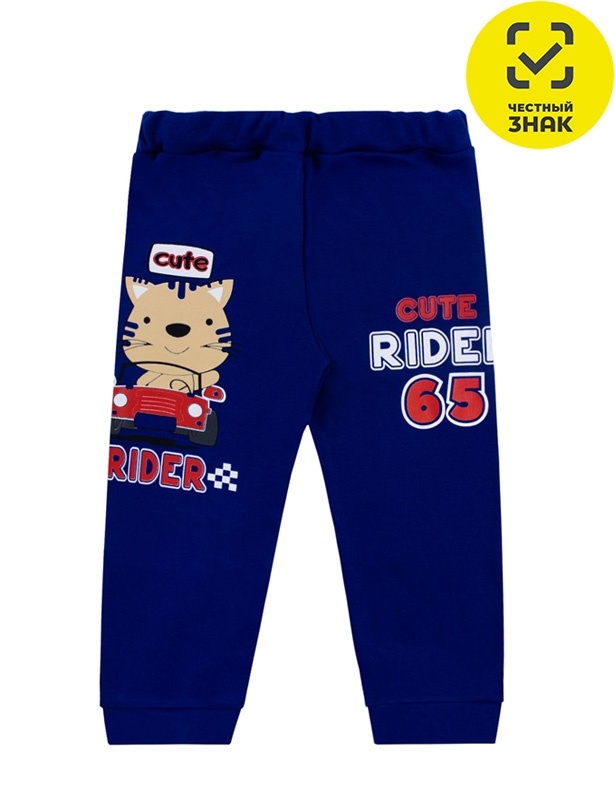 Брюки ясельные из интерлока, на поясе на резинке, по низу на манжетах, спереди декорированы принтами.