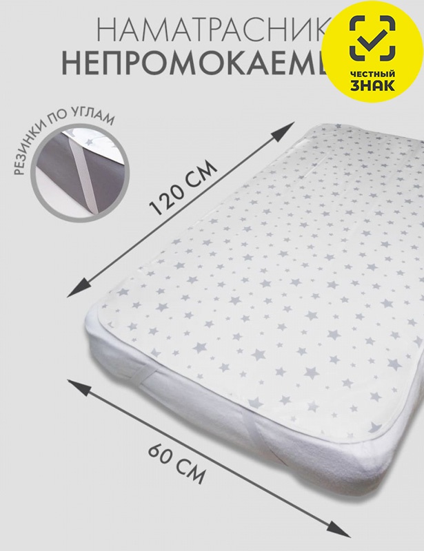 Наматрасник непромокаемый 60х120 см на резинках-держателях по углам. Производится из специального плотного материала с ПВХ покрытием. Верх - водонепроницаемое покрытие, низ - тканевая основа. Окантован по периметру. Обладает отличной теплопроводностью.