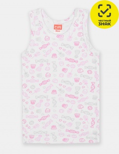 Майка для девочки, выполнена из набивной рибаны с широким плечом. Горловина и проймы обработаны окантовкой из основного полотна.