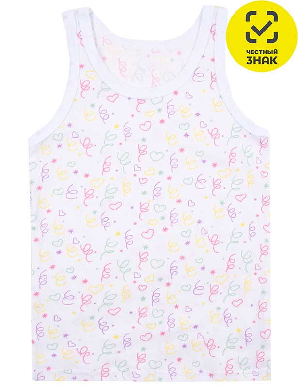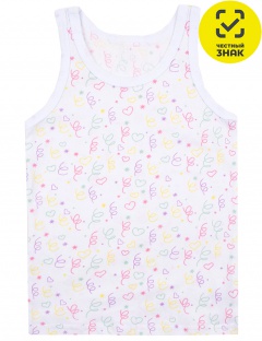 Классическая майка для девочки, из набивного кулирного полотна, проймы и ворот окантованы.