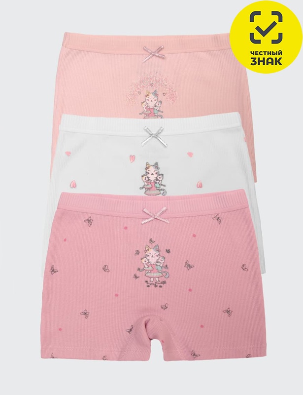 Трусы для девочек 3 шт. Идеальная посадка обеспечивает максимальный комфорт при носке. Яркие принты из натуральной краски, которая не трескается и не изнашивается при повседневной стирке. Чтобы ткань не вытягивалась и не деформировалась при носке, в состав хлопка добавлен эластан (5%). Цена указана за набор – 3шт.