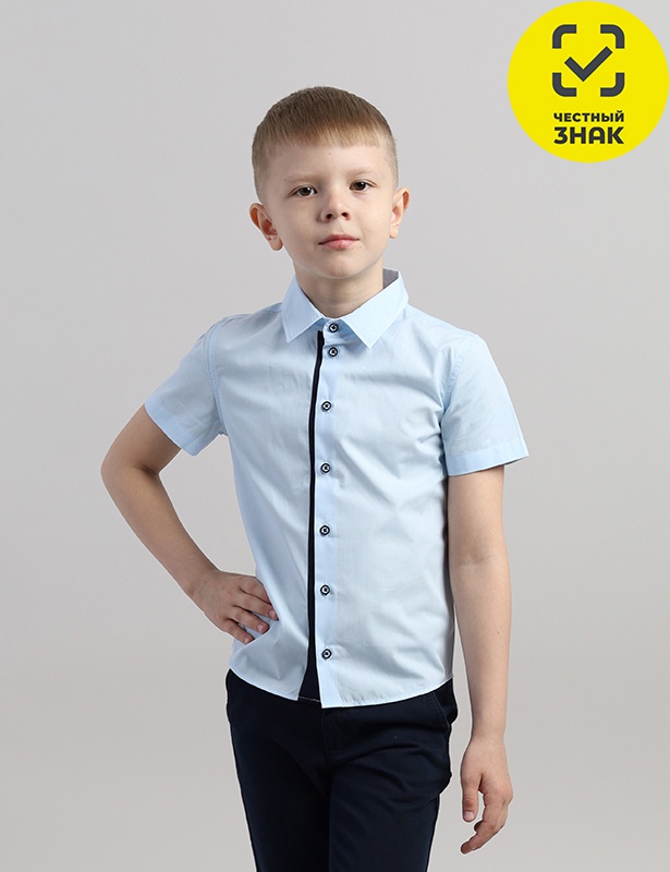 Рубашка классическая, полуприталенного силуэта, с коротким рукавом из хлопка. Воротник обтачной с притачной стойкой. Планка оформлена декоративным кантом контрастного цвета.