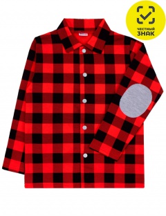 Рубашка для мальчика из футера двухнитки с начесом, с длинными втачными рукавами с манжетами и заплатками на локтях, отложной воротник, застежка центральная на кнопки.