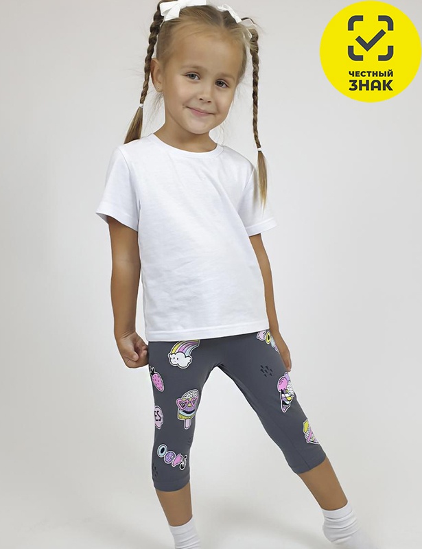 Бриджи для девочки, облегающего силуэта, по талии на резинке, без бокового шва, декорированы принтом.
