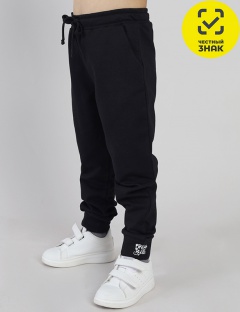 Брюки для мальчика из футера без начеса. Пояс из основной ткани и эластичной резинкой внутри, шнурок функциональный с пластиковым наконечником. Низ брюк с манжетой из полотна с добавлением лайкры, отрезная вставка на манжете декорирована принтом.