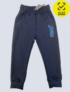 Брюки для мальчика из футера с лайкрой, на эластичном поясе с кулиской и со шнуром, по низу на манжетах, карманы по бокам, спереди печать.