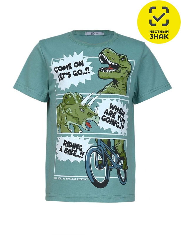 Футболка для мальчика прямого силуэта, перед с печатью, рукав втачной короткий. Горловина обработана ластиком. Низ изделия и рукава подшиты.