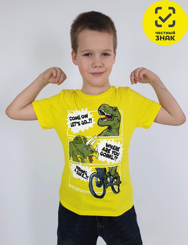 Футболка для мальчика прямого силуэта, перед с печатью, рукав втачной короткий. Горловина обработана ластиком. Низ изделия и рукава подшиты.
