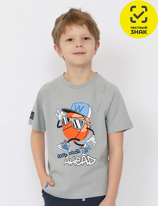 Футболка оверсайз для мальчика из кулирной глади. Рукав-реглан, горловина обработана притачной бейкой из рибаны с лайкрой. Перед декорирован принтом "Впереди хорошие дни?". Рукав декорирован вязаной нашивкой.