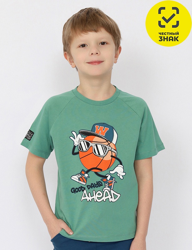 Футболка оверсайз для мальчика из кулирной глади. Рукав-реглан, горловина обработана притачной бейкой из рибаны с лайкрой. Перед декорирован принтом "Впереди хорошие дни?". Рукав декорирован вязаной нашивкой.