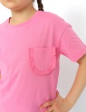 Футболка со спущенным плечом и короткими рукавами. Спереди карман декорирован ришелье. Горловина круглая, обработана притачной бейкой. По ростку горловины шов притачивания закрыт долевиком.