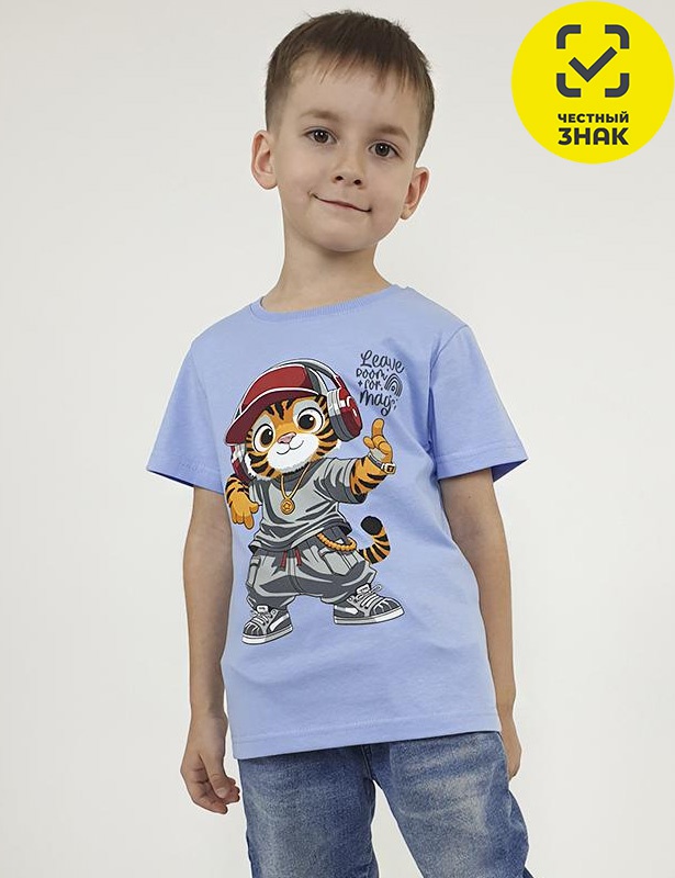 Футболка для мальчика имеет прямой силуэт, короткий втачной рукав и горловину, обработанную ластиком. На передней части футболки расположена печать.