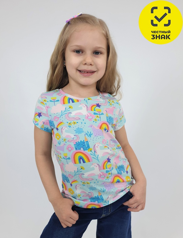 Футболка для девочки, полуприлегающий силуэт, короткий втачной рукав. Горловина обработана притачной планкой. Низ рукава и низ изделия подшит.