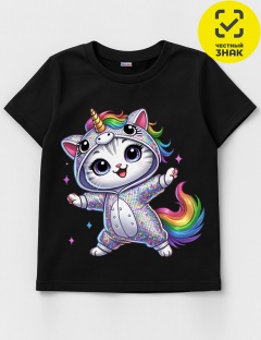 Футболка прямого кроя, горловина окантовнан, короткий втачной рукав. Декорирована принтом.