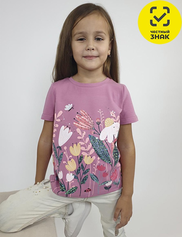 Производитель: ИП Лунева Артикул: 6-76-4 Футболка для девочки Пол: девочка Полотно: кулирная гладь Состав: 95% хлопок, 5% лайкра Возраст: 2-7
