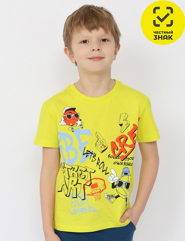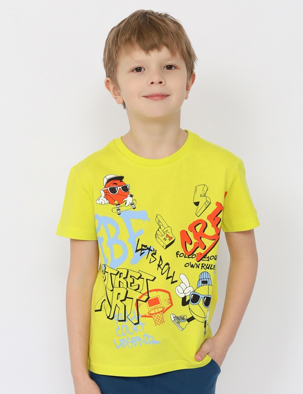 Футболка оверсайз для мальчика из кулирной глади. Рукав втачной, горловина обработана притачной бейкой из рибаны с лайкрой. Перед декорирован принтом панно "Уличный Арт."