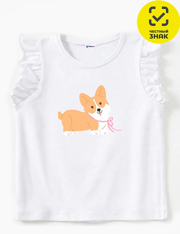 Футболка для девочки прямого кроя, короткий втачной рукав-рюша, округлая горловина окантована, на полочке выполнена печать.