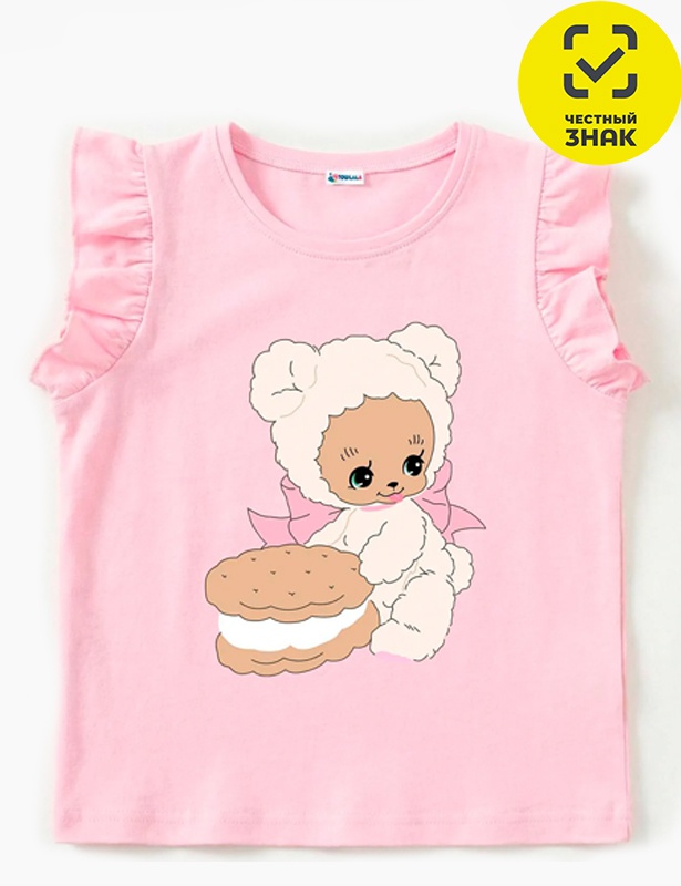 Футболка для девочки прямого кроя, короткий втачной рукав-рюша, округлая горловина окантована, на полочке выполнена печать.