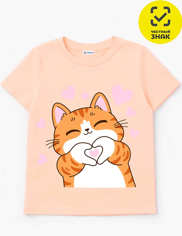 Футболка для девочки из кулирного полотна, с короткими втачными рукавами, округлая горловина, перед декорирован принтом.
