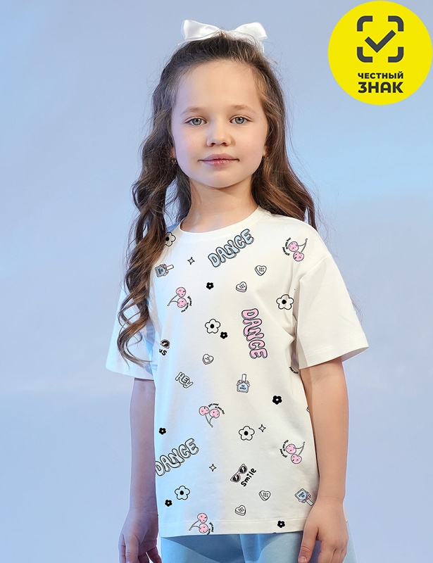 Футболка для девочки, прямого кроя, горловина окантована, короткий втачной рукав. Декорирована принтом.