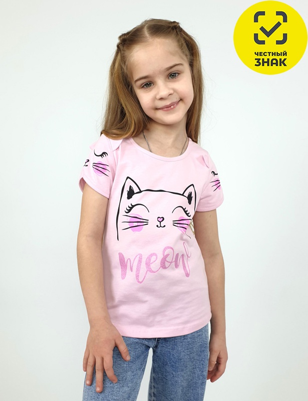 Фуфайка для девочки - прямого силуэта, перед и рукава с печатью. Рукав втачной, короткий, с отделочными "ушками". Горловина и низ окантованы.