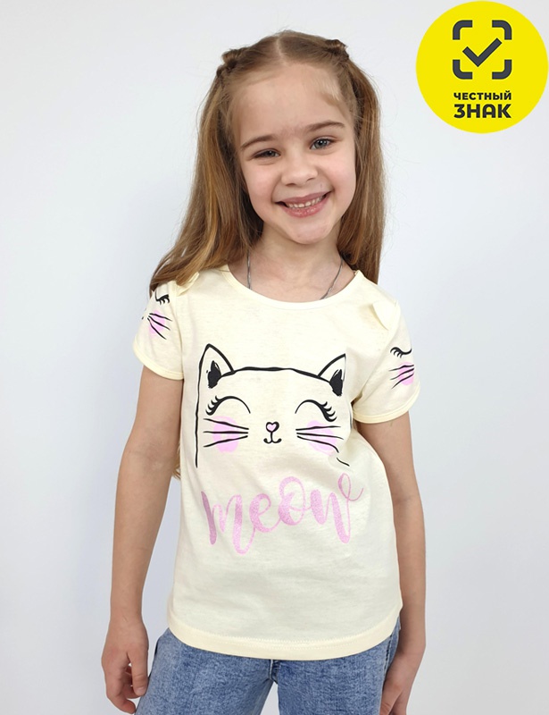 Фуфайка для девочки - прямого силуэта, перед и рукава с печатью. Рукав втачной, короткий, с отделочными "ушками". Горловина и низ окантованы.