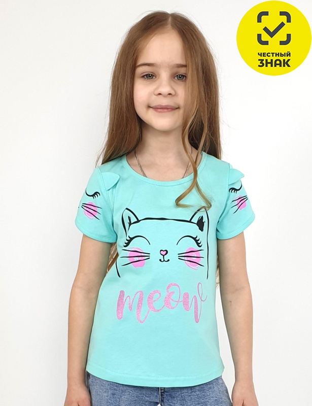 Фуфайка для девочки - прямого силуэта, перед и рукава с печатью. Рукав втачной, короткий, с отделочными "ушками". Горловина и низ окантованы.