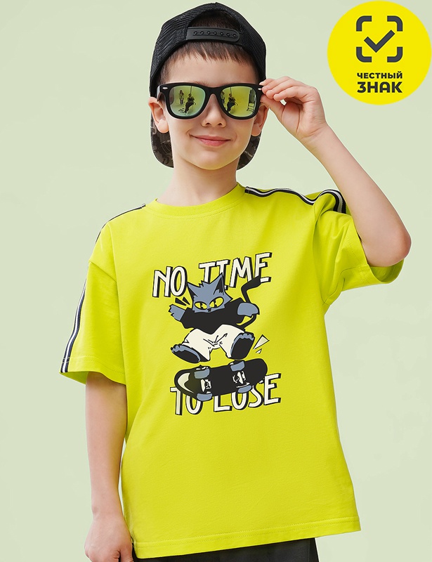 Яркая неоново-зелёная футболка из 100 % хлопка - идеальный выбор для активного мальчика. Модель привлекает внимание сочным цветом и продуманными деталями: стильной декоративной тесьмой на плечах и выразительным принтом на передней части.