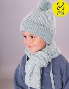 Комплект для мальчика. Теплая шапка на завязках, с отворотом и хлопковым подкладом, декорирована помпоном и стильной нашивкой. Шарф вязаный однослойный.