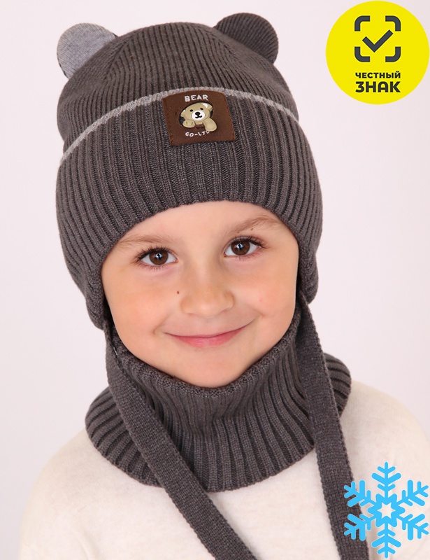 Набор для мальчика шапка+снуд, выполнен из пряжи с добавлением шерсти, на подкладе из флиса. Шапка с широким отворотом, на завязках, декорирована нашивкой и ушками.