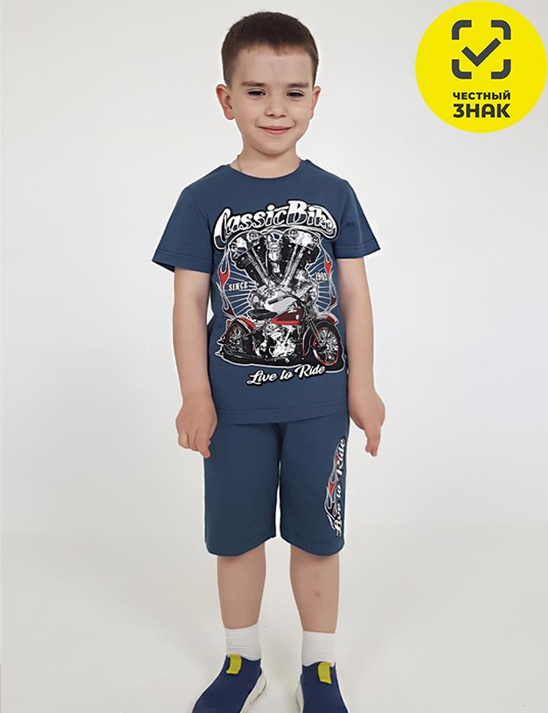 Комплект для мальчика состоит из 2-х предметов. Футболка прямая с печатью, короткий втачной рукав. Горловина обработана ластиком. Шорты удлиненные с притачным поясом и резинкой. Два боковых кармана на переде, печать на левой передней половинке.