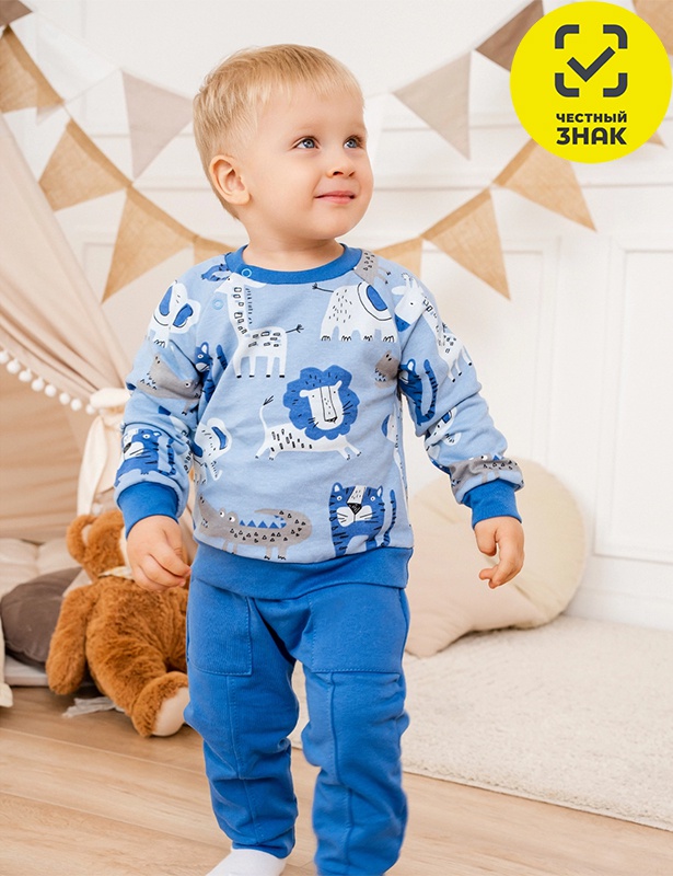 Костюм ясельный из футера двухнитки с микро-начесом состоит из 2-х предметов. Джемпер с длинными рукавами-реглан на манжетах, округлый вырез горловины с застежкой на кнопки по линии реглана, печать на полочке. Брюки на поясе на резинке, внизу на манжетах, накладные карманы.