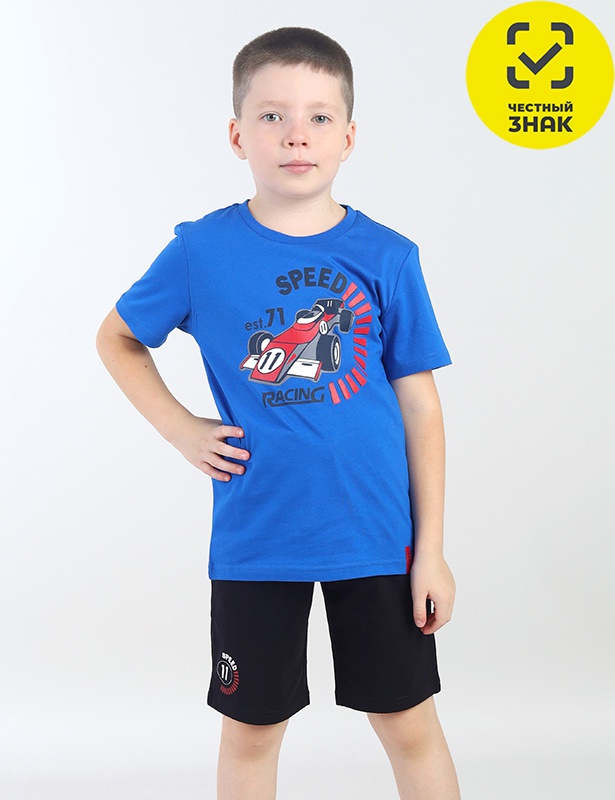 Комплект для мальчика (футболка, шорты) из мягкого трикотажа. Горловина футболки круглая, оформлена кашкорсе. На полочке выполнена шелкография - гоночный болид и надпись "Рэйсинг. Скорость.". Шорты из трикотажа, пояс на резинке. Кулиска с контрастным шнурком в цвет принта. На передней части шорт шелкография - номер гоночного болида.