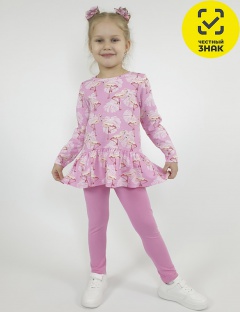 Комплект для девочки состоит из футболки и лосин. Футболка имеет силуэт трапеции, внизу — волан. Рукав втачной, длинный. Горловина обработана планкой. Лосины длинные, вверху на резинке.