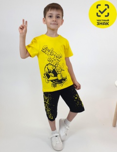 Комплект для мальчика состоит из джемпера и шорт. Прямой джемпер с коротким втачным рукавом, перед декорирован печатью. Горловина обработана ластиком. Шорты удлинённые, с притачным поясом и резинкой, без бокового шва. Шорты декорированы печатью сбоку.