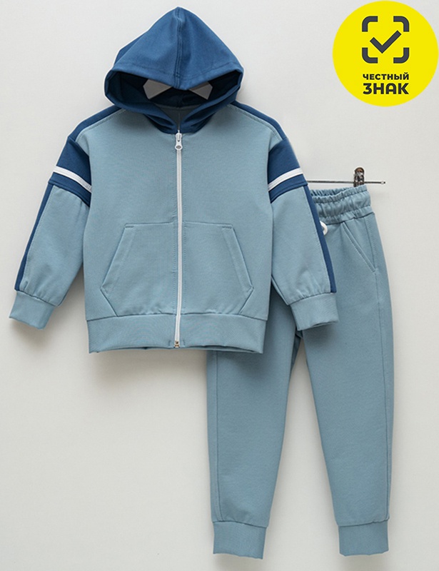 Спортивный костюм для мальчика состоит из куртки и брюк из гладкокрашенного полотна. Куртка с капюшоном и карманами застёгивается на молнию. Рукава длинные, с манжетами, декорированными контрастными вставками. Брюки оснащены поясом с кулиской и шнуром, боковыми карманами, а по низу оформлены манжетами.