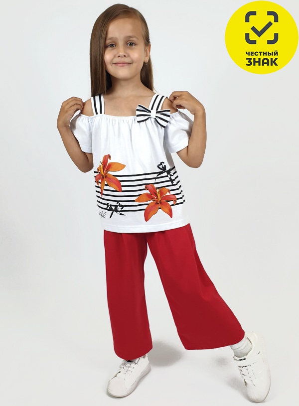 Комплект для девочки выполнен из кулирного полотна Верх: футболка - силуэт трапеция на бретелях, открытые плечи. Печать на переде, спинке, бретелях, бантике. Вырез горловины обработан с резинкой. Отделочный бант с левой стороны. Низ изделия и рукава подшиты. Низ: брюки -прямые, укороченные, мягкие встречные складки на переде. Притачной пояс с резинкой.