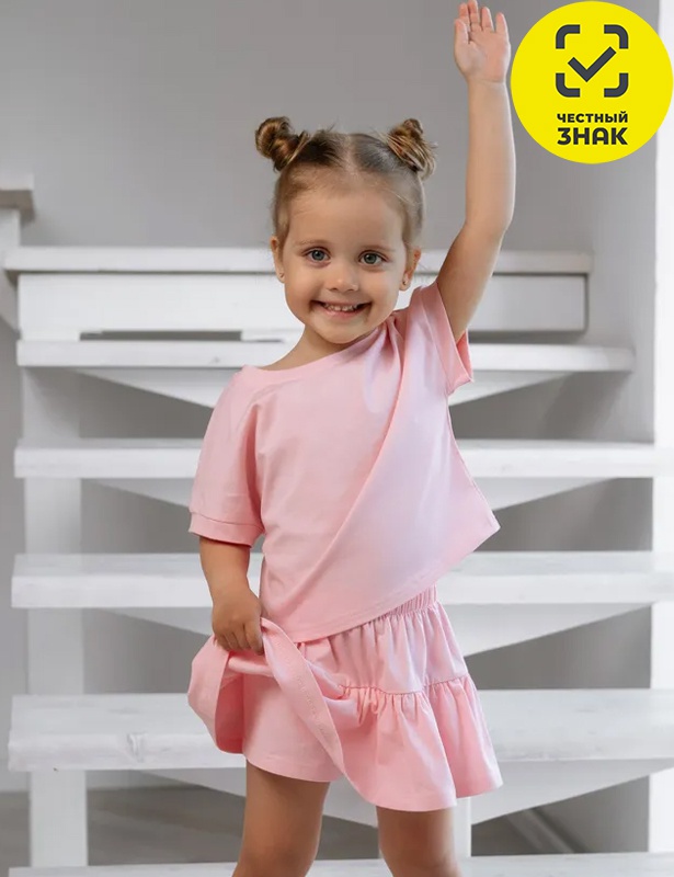 Комплект для девочки из хлопкового гладкокрашеного кулирного полотна состоит из 2-х предметов. Футболка с короткими цельнокроенными рукавами с окантовкой, округлой горловиной, свободного силуэта. Юбка на кокетке, с широким воланом, по талии на резинке.