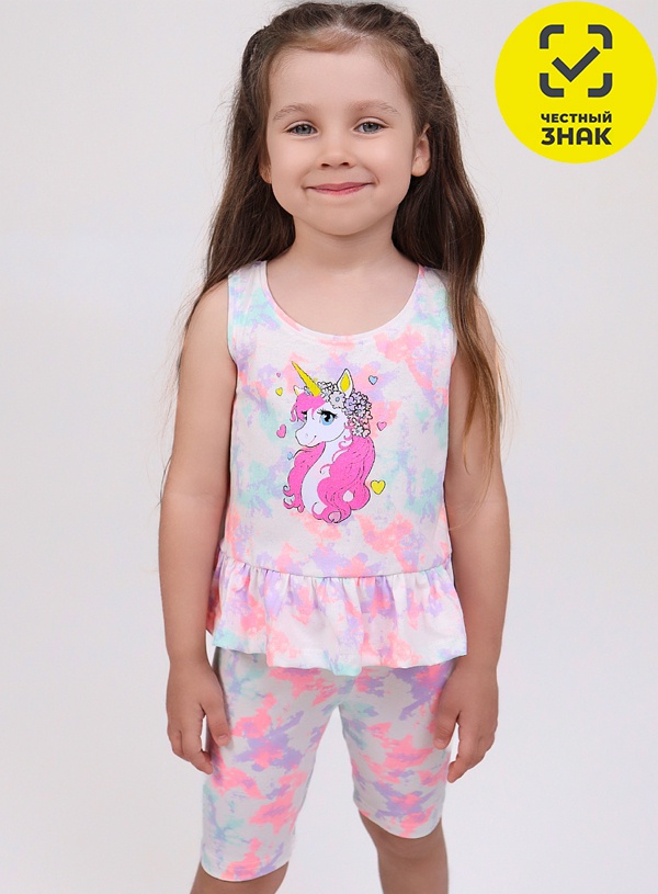 Комплект для девочки из набивного трикотажного полотна. Топ без рукавов, с округлой горловиной, отрезной, по низу волан, на полочке принт. Велосипедки из хлопкового плотна с добавлением лайкры, по талии на резинке, низ подшит.