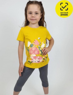 Комплект для девочки состоит из 2-х предметов. Футболка прямого силуэта, печать и вышивка на переде, короткий втачной рукав. Низ рукава и футболки подшит. Горловина обработана ластиком. Лосины укороченные, вверху на резинке.