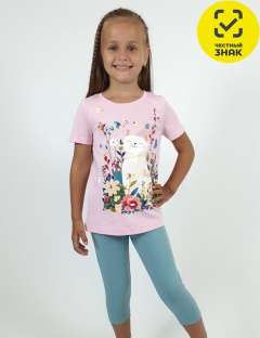 Комплект для девочки: джемпер с короткими рукавами и бриджи. Джемпер из 100%го хлопка - прямой силуэт, печать и вышивка (пайетки) на переде. Короткий, втачной рукав. Низ рукава и джемпера подшит. Горловина обработана ластиком. Лосины - укороченные, вверху на резинке выполнены из кулирной глади 95% хлопок и 5% лайкры.