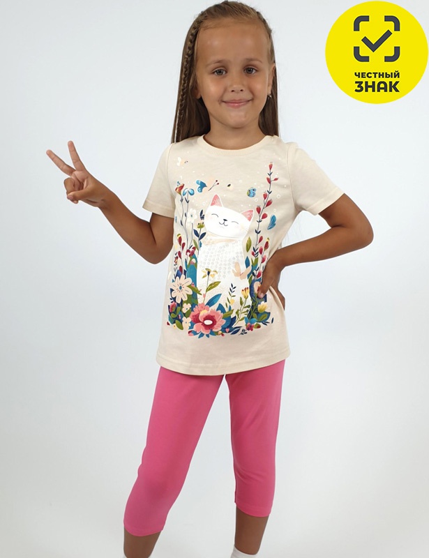 Комплект для девочки: джемпер с короткими рукавами и бриджи. Джемпер из 100%го хлопка - прямой силуэт, печать и вышивка (пайетки) на переде. Короткий, втачной рукав. Низ рукава и джемпера подшит. Горловина обработана ластиком. Лосины - укороченные, вверху на резинке выполнены из кулирной глади 95% хлопок и 5% лайкры.